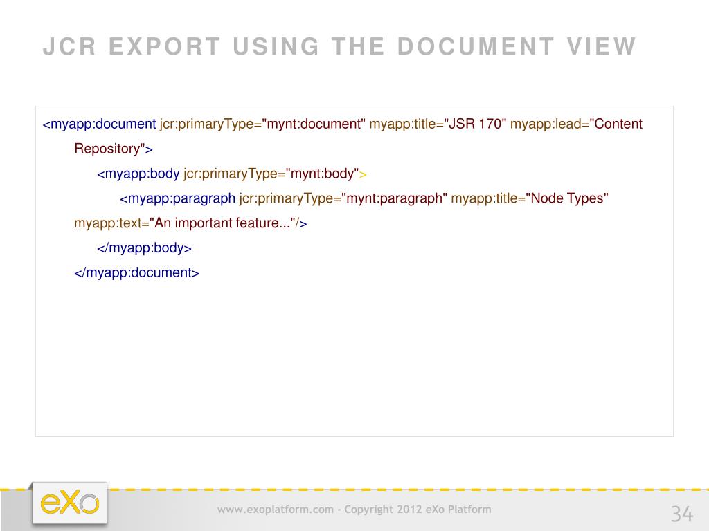 JCR EXPORT USING THE DOCUMENT VIEW <myapp:documentjcr:primaryType="mynt:document"myapp:title="JSR 170"myapp:lead="Content Repository"><myapp:bodyjcr:primaryType="mynt:body"><myapp:paragraphjcr:primaryType="mynt:paragraph"myapp:title="Node Types"myapp:text="An important feature..."/></myapp:body></myapp:document>