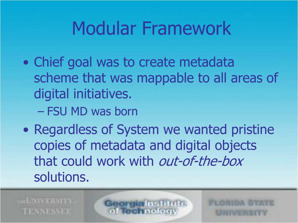 Modular Framework • Chief goal was to create metadata scheme that was mappable to all areas of digital initiatives. • FSU MD was born • Regardless of System we wanted pristine copies of metadata and digital objects that could work with out-of-the-box solutions.