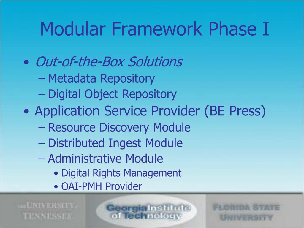 Modular Framework Phase I • Out-of-the-Box Solutions • Metadata Repository • Digital Object Repository • Application Service Provider (BE Press) • Resource Discovery Module • Distributed Ingest Module • Administrative Module • Digital Rights Management • OAI-PMH Provider