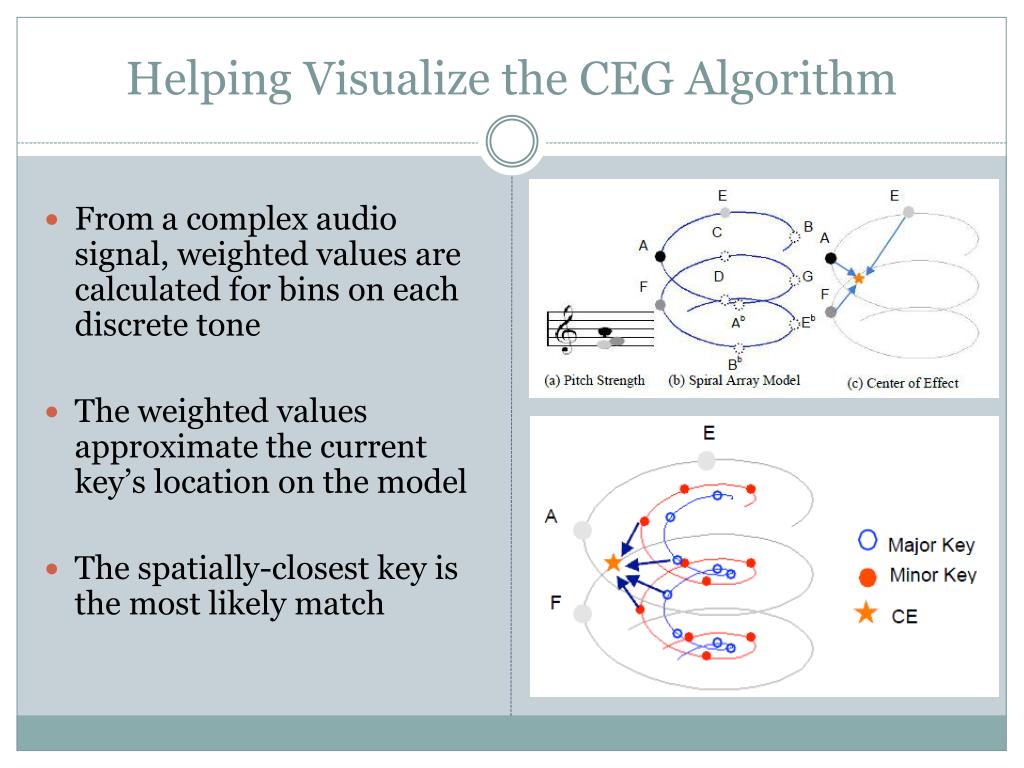 Helping Visualize the CEG Algorithm From a complex audio signal, weighted values are calculated for bins on each discrete tone The weighted values approximate the current key’s location on the model The spatially-closest key is the most likely match