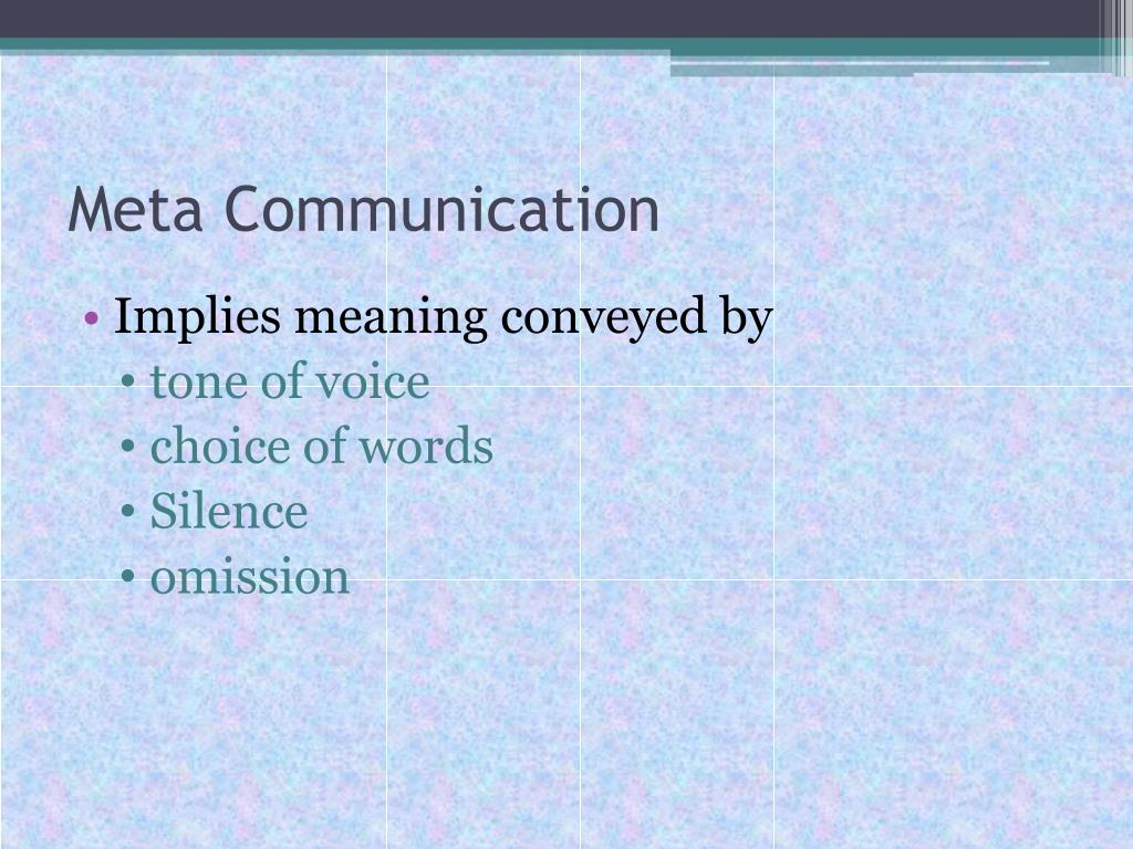 Meta Communication • Implies meaning conveyed by • tone of voice • choice of words • Silence • omission