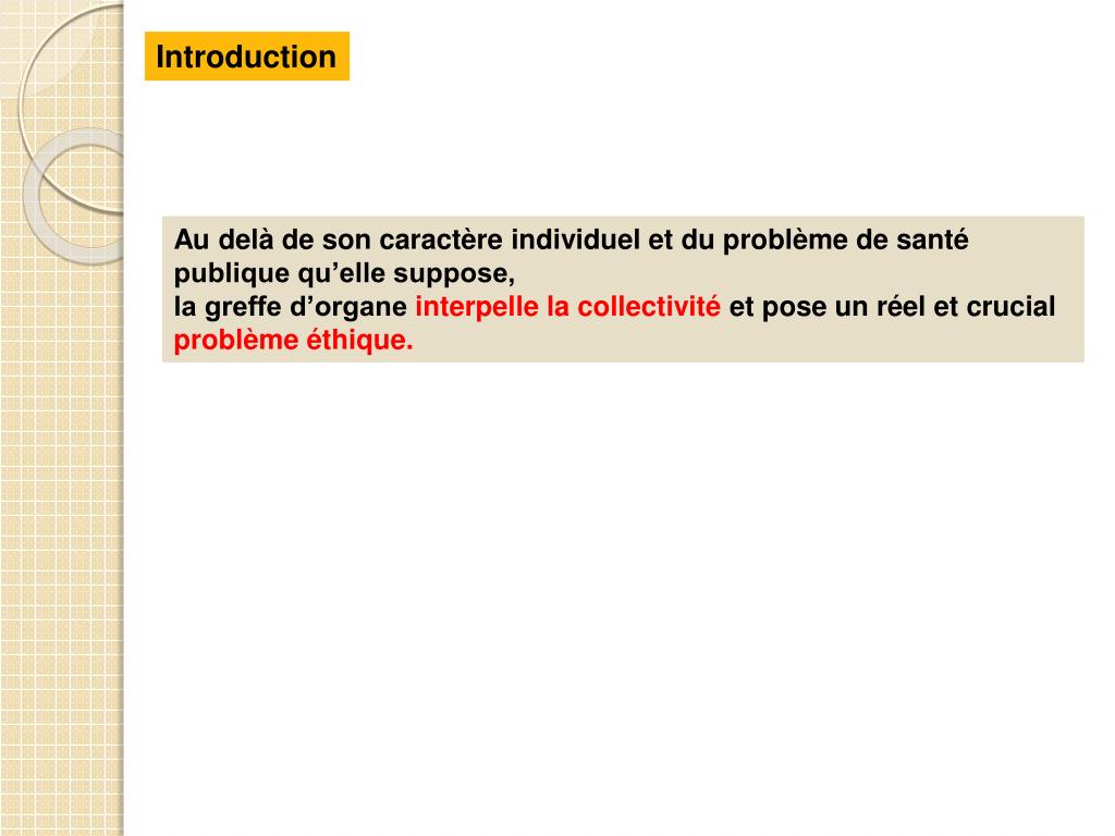Introduction Au delà de son caractère individuel et du problème de santé publique qu’elle suppose, la greffe d’organe interpelle la collectivité et pose un réel et crucial problème éthique.