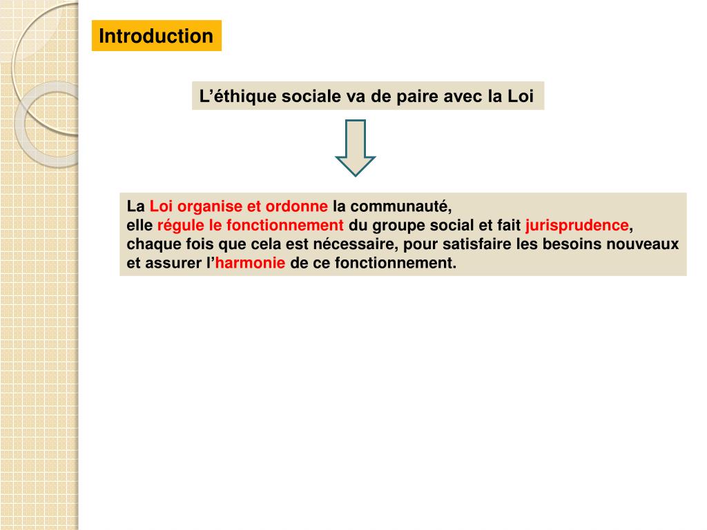 Introduction L’éthique sociale va de paire avec la Loi La Loi organise et ordonne la communauté, elle régule le fonctionnement du groupe social et fait jurisprudence, chaque fois que cela est nécessaire, pour satisfaire les besoins nouveaux et assurer l’harmonie de ce fonctionnement.