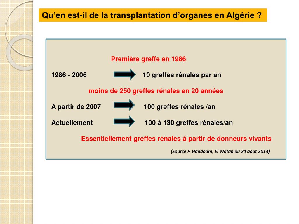 Qu’en est-il de la transplantation d’organes en Algérie? • Greffes rénales à partir de donneurs en état de mort encéphalique (EME) • deux expériences : succès • 2002 à Constantine • 2011 puis 2012 à Blida. • cinq donneurs «cadavériques» : 10 reins greffe rénale à partir de donneurs en EME marginale • (Source F. Haddoum, El Watan du 24 aout 2013)
