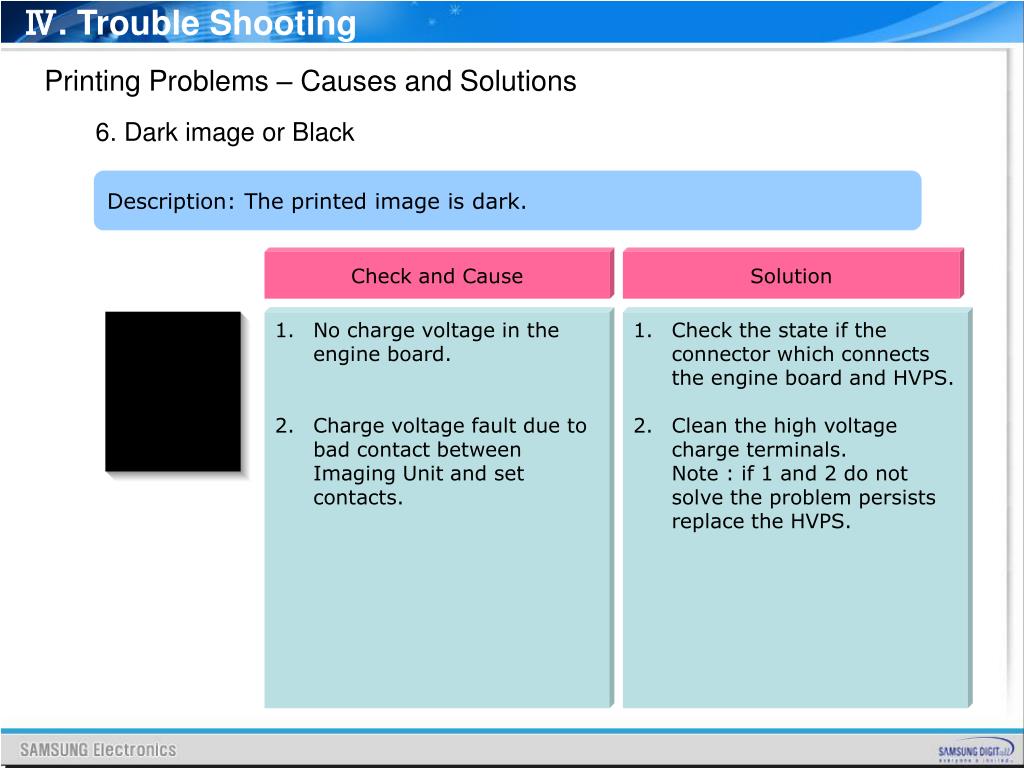 Ⅳ. Trouble Shooting Printing Problems – Causes and Solutions 6. Dark image or Black Description: The printed image is dark. Check and Cause Solution • No charge voltage in the engine board. • Charge voltage fault due to bad contact between Imaging Unit and set contacts. • Check the state if the connector which connects the engine board and HVPS. • Clean the high voltage charge terminals. • Note : if 1 and 2 do not solve the problem persists replace the HVPS.