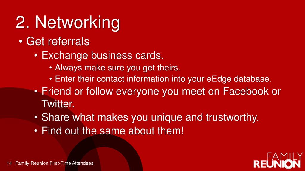 2. Networking • Get referrals • Exchange business cards. • Always make sure you get theirs. • Enter their contact information into your eEdge database. • Friend or follow everyone you meet on Facebook or Twitter. • Share what makes you unique and trustworthy. • Find out the same about them! Family Reunion First-Time Attendees