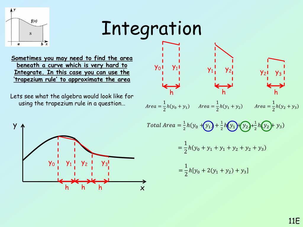 Integration Sometimes you may need to find the area beneath a curve which is very hard to Integrate. In this case you can use the ‘trapezium rule’ to approximate the area Lets see what the algebra would look like for using the trapezium rule in a question… y0 y1 y1 y2 y2 y3 h h h y + y0 y1 y2 y3 h x h h 11E