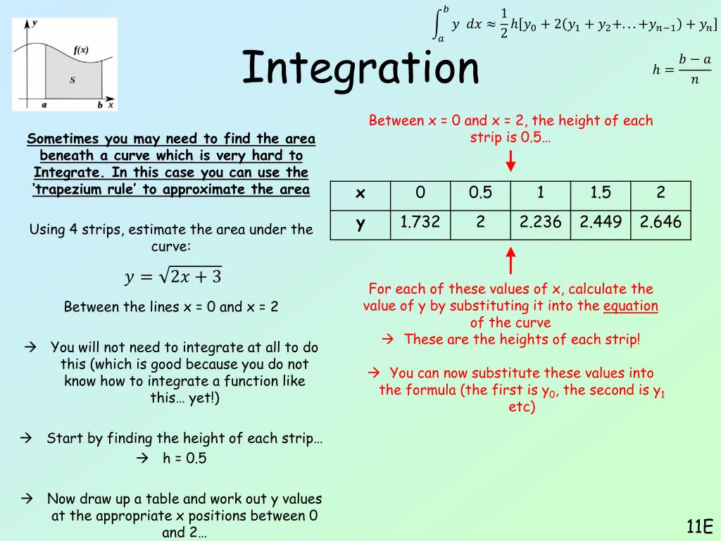 Integration Sometimes you may need to find the area beneath a curve which is very hard to Integrate. In this case you can use the ‘trapezium rule’ to approximate the area As a general case, the trapezium rule looks like this: and The height of each strip is given by the difference between the limits, divided by ‘n’, the number of strips… 11E