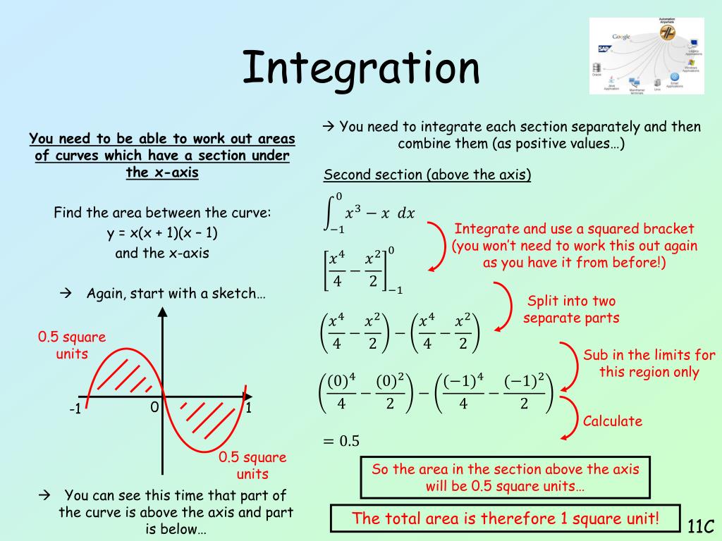 Integration You need to integrate each section separately and then combine them (as positive values…) You need to be able to work out areas of curves which have a section under the x-axis Find the area between the curve: y = x(x + 1)(x – 1) and the x-axis • Again, start with a sketch… • You can see this time that part of the curve is above the axis and part is below… Second section (above the axis) Integrate and use a squared bracket (you won’t need to work this out again as you have it from before!) Split into two separate parts 0.5 square units Sub in the limits for this region only 0 1 -1 Calculate 0.5 square units So the area in the section above the axis will be 0.5 square units… The total area is therefore 1 square unit! 11C