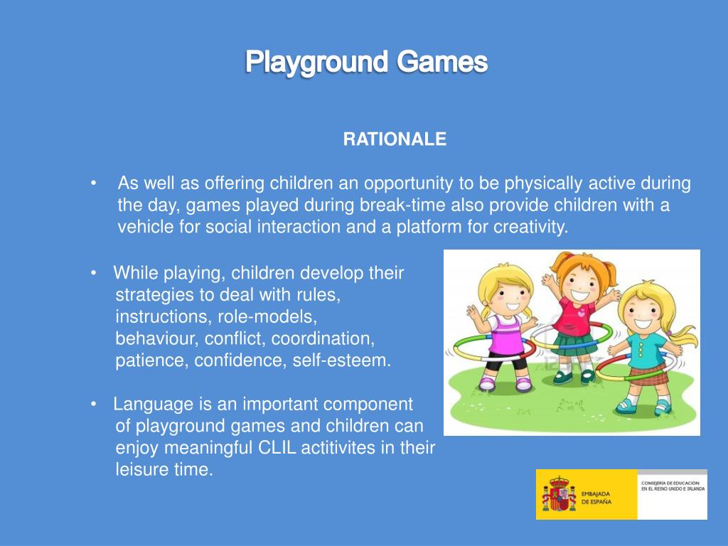 Playground Games • RATIONALE • As well as offering children an opportunity to be physically active during the day, games played during break-time also provide children with a vehicle for social interaction and a platform for creativity. • Whileplaying, childrendeveloptheir • strategiestodealwith rules, • instructions, role-models, • behaviour, conflict, coordination, • patience, confidence, self-esteem. • Languageisanimportantcomponent • of playgroundgames and children can • enjoymeaningful CLIL actitivites in their • leisure time.