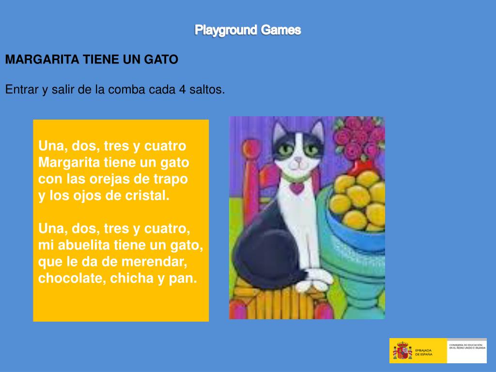 Playground Games MARGARITA TIENE UN GATO Entrar y salir de la comba cada 4 saltos. Una, dos, tres y cuatro Margarita tiene un gato con las orejas de trapo y los ojos de cristal. Una, dos, tres y cuatro, mi abuelita tiene un gato, que le da de merendar, chocolate, chicha y pan.