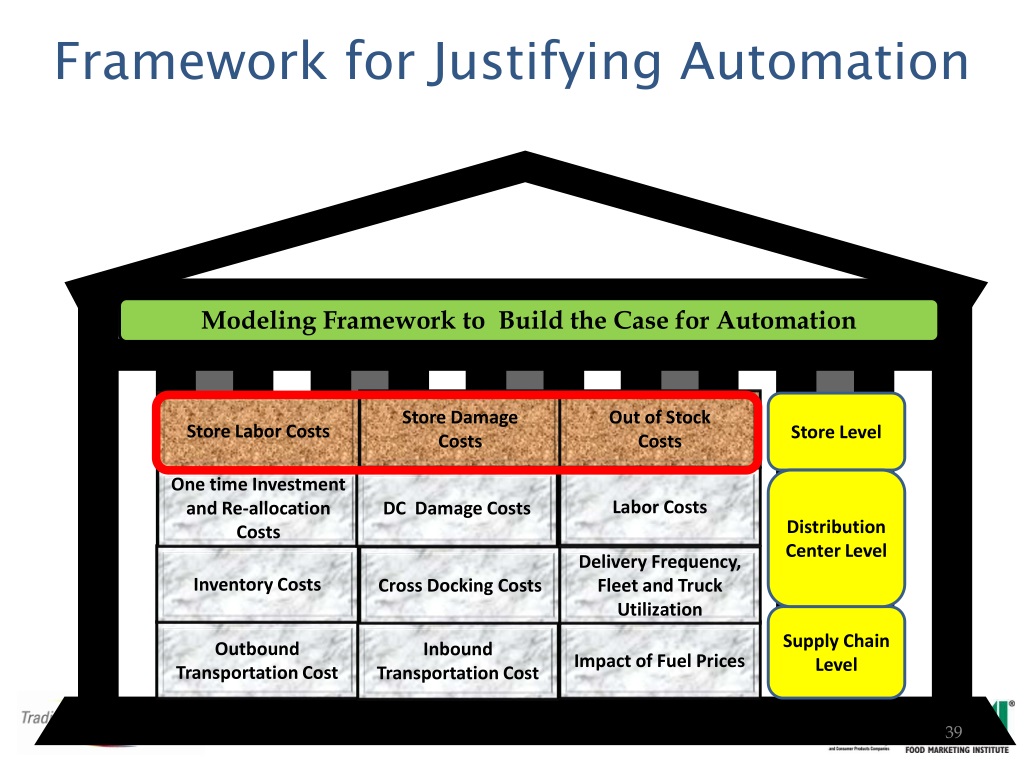 Framework for Justifying Automation Store Damage Costs Out of Stock Costs Store Labor Costs Modeling Framework to Build the Case for Automation Labor Costs One time Investment and Re-allocation Costs DC Damage Costs Store Level Inventory Costs Cross Docking Costs Delivery Frequency, Fleet and Truck Utilization Distribution Center Level Outbound Transportation Cost Impact of Fuel Prices Inbound Transportation Cost Supply Chain Level