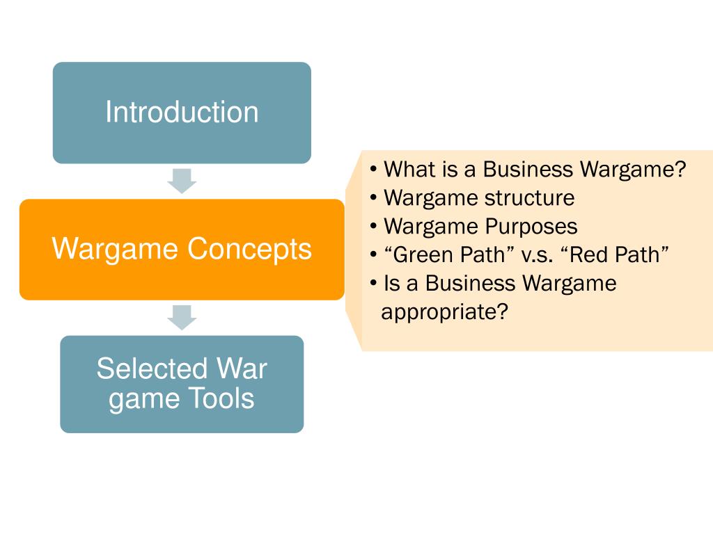 What is a Business Wargame? • Wargame structure • Wargame Purposes • “Green Path” v.s. “Red Path” • Is a Business Wargame appropriate?