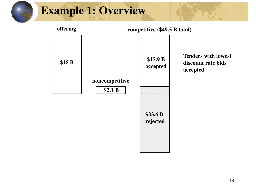 Example 1: Overview offering competitive ($49.5 B total) Tenders with lowest discount rate bids accepted $15.9 B accepted $18 B noncompetitive $2.1 B $33.6 B rejected
