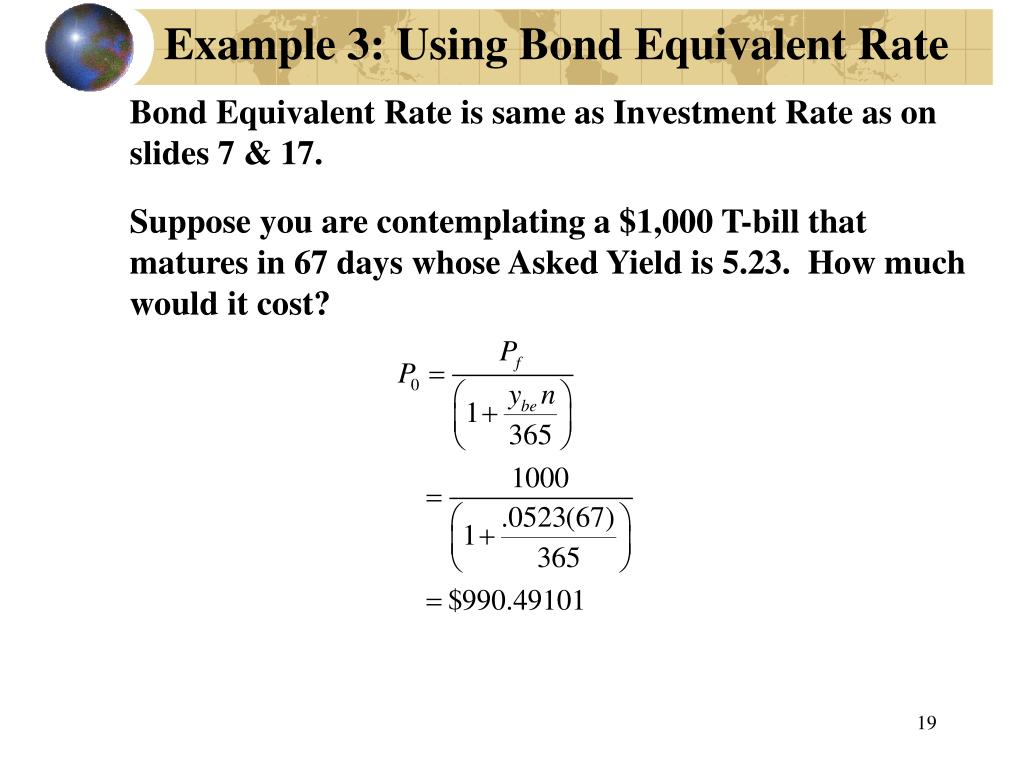 Example 3: Using Bond Equivalent Rate Bond Equivalent Rate is same as Investment Rate as on slides 7 & 17. Suppose you are contemplating a $1,000 T-bill that matures in 67 days whose Asked Yield is 5.23. How much would it cost?