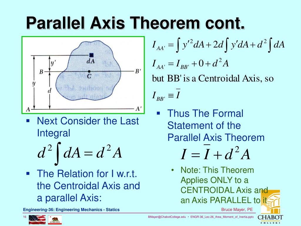 Next Consider the Last Integral Parallel Axis Theorem cont. • Thus The Formal Statement of the Parallel Axis Theorem • Note: This Theorem Applies ONLY to a CENTROIDAL Axis and an Axis PARALLEL to it • The Relation for I w.r.t. the Centroidal Axis and a parallel Axis:
