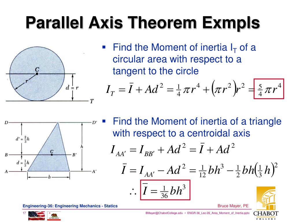 Parallel Axis Theorem Exmpls • Find the Moment of inertia IT of a circular area with respect to a tangent to the circle • Find the Moment of inertia of a triangle with respect to a centroidal axis