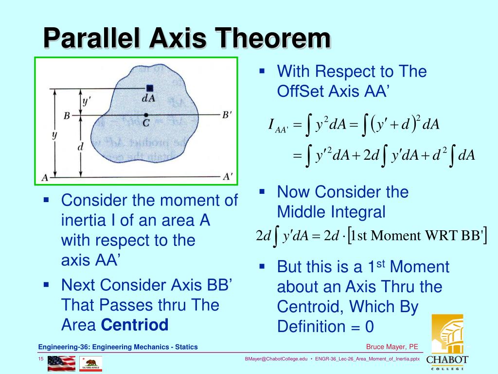 With Respect to The OffSet Axis AA’ Consider the moment of inertia I of an area A with respect to the axis AA’ Next Consider Axis BB’ That Passes thru The Area Centriod Parallel Axis Theorem • Now Consider the Middle Integral • But this is a 1st Moment about an Axis Thru the Centroid, Which By Definition = 0