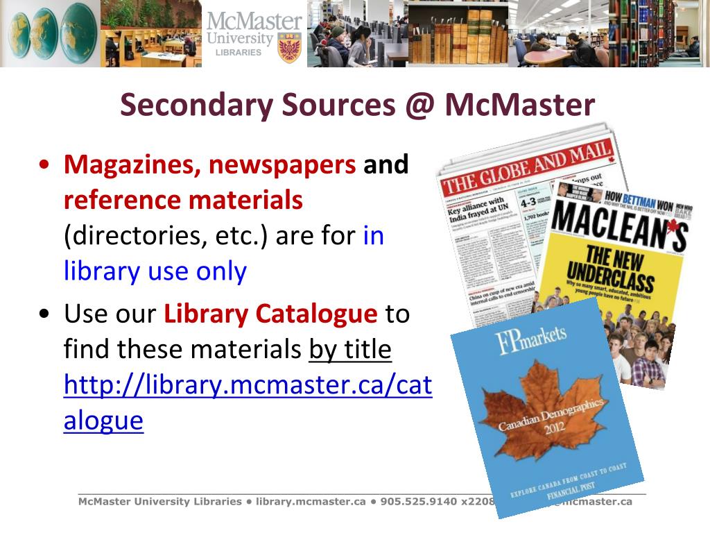Secondary Sources @ McMaster • Magazines, newspapers and reference materials (directories, etc.) are for in library use only • Use our Library Catalogue to find these materials by titlehttp://library.mcmaster.ca/catalogue