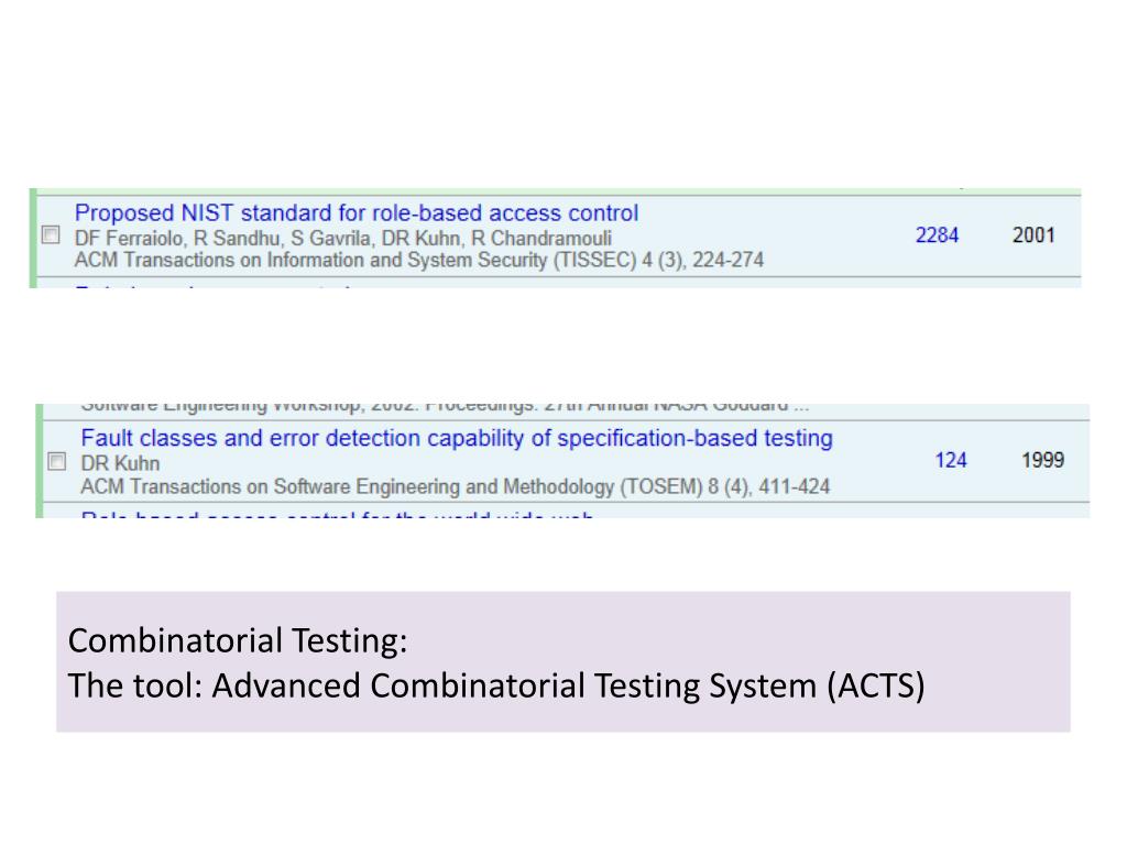 Rick Kuhn Computer Security Division National Institute of Standards and Technology (NIST) Role based access control Security Quantum cryptography Software assurance Combinatorial testing. Combinatorial Testing: The tool: Advanced Combinatorial Testing System (ACTS).