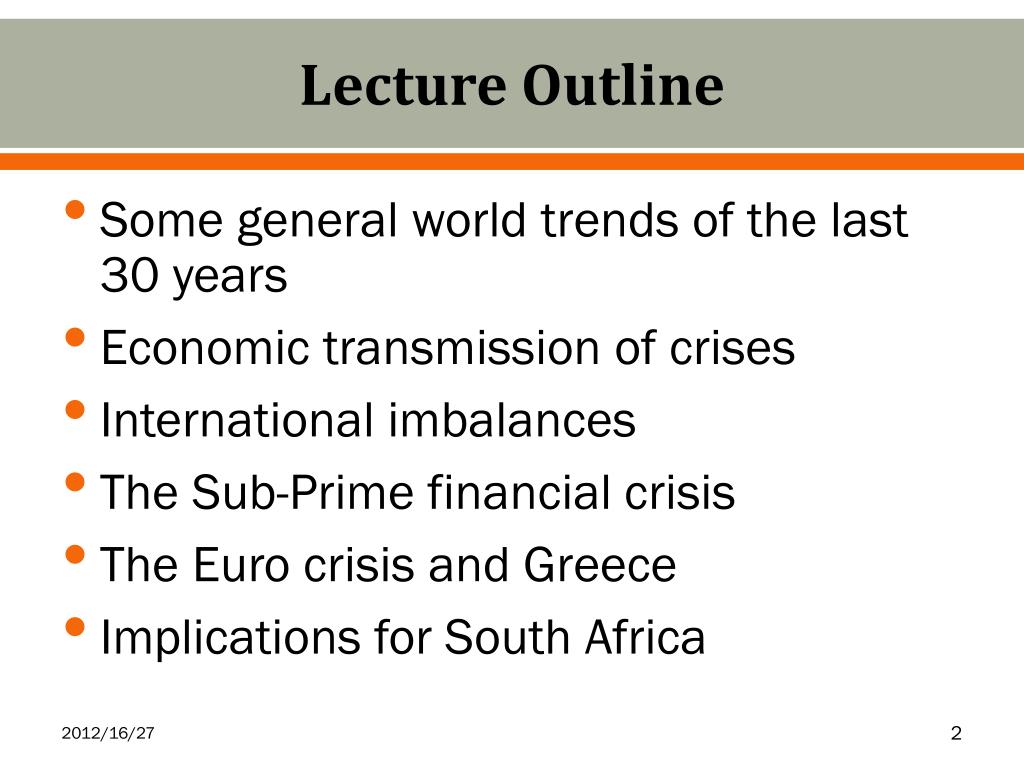 Lecture Outline • Some general world trends of the last 30 years • Economic transmission of crises • International imbalances • The Sub-Prime financial crisis • The Euro crisis and Greece • Implications for South Africa