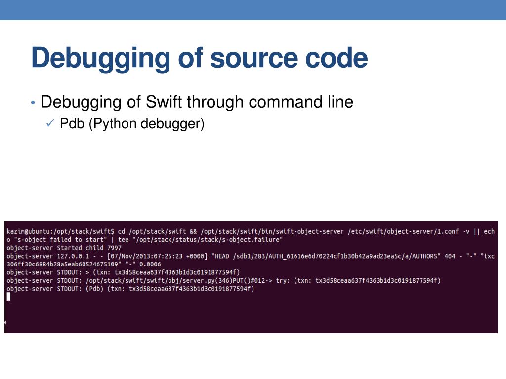 Debugging of source code • Debugging of Swift through command line • Pdb (Python debugger)