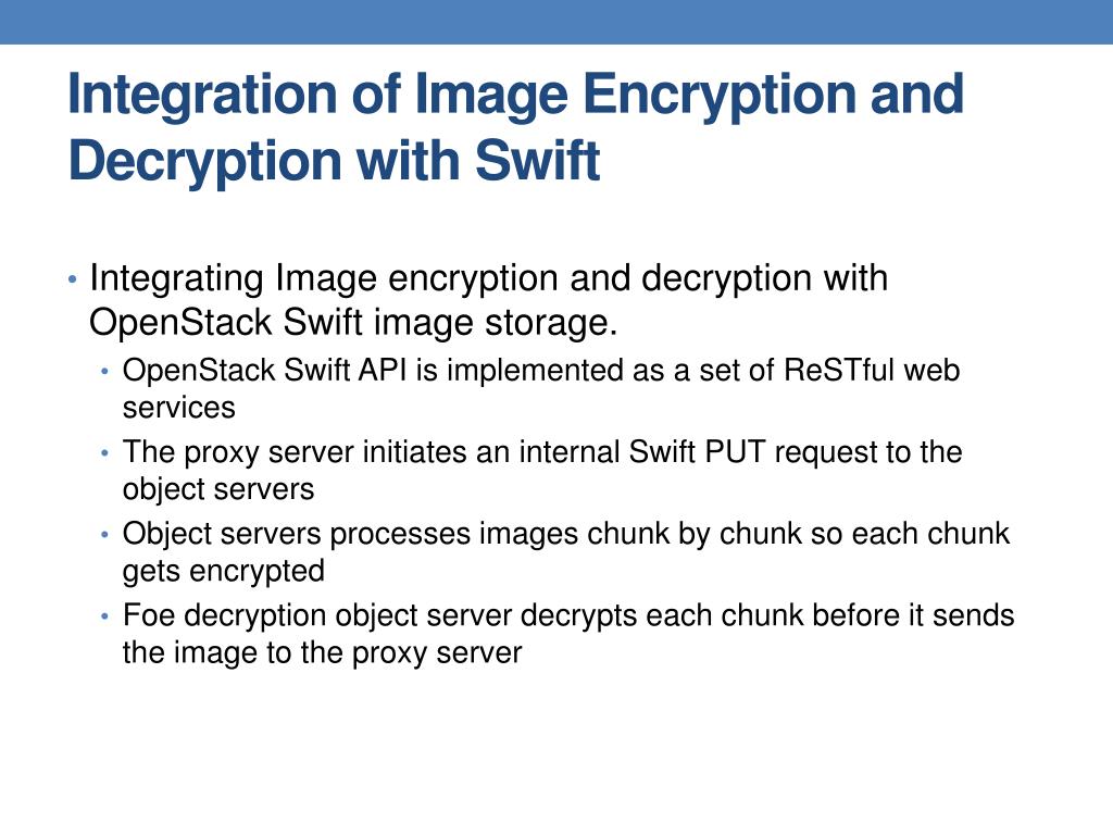 Integration of Image Encryption and Decryption with Swift • Integrating Image encryption and decryption with OpenStack Swift image storage. • OpenStack Swift API is implemented as a set of ReSTful web services • The proxy server initiates an internal Swift PUT request to the object servers • Object servers processes images chunk by chunk so each chunk gets encrypted • Foe decryption object server decrypts each chunk before it sends the image to the proxy server