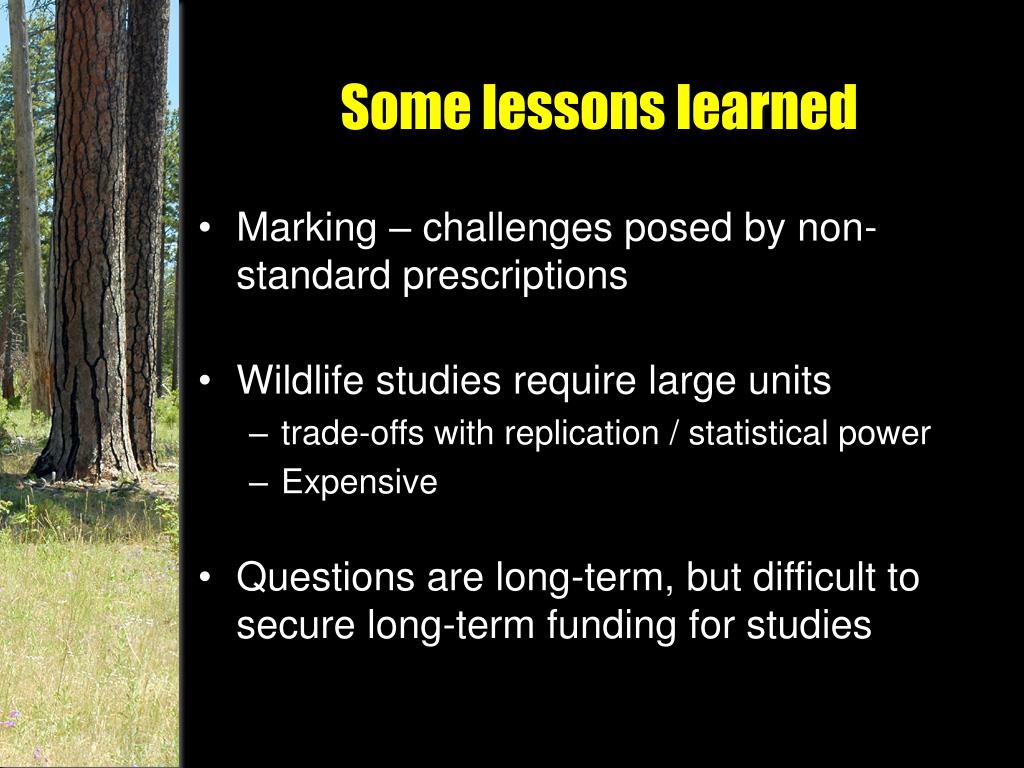 Some lessons learned Marking – challenges posed by non-standard prescriptions Wildlife studies require large units trade-offs with replication / statistical power Expensive Questions are long-term, but difficult to secure long-term funding for studies