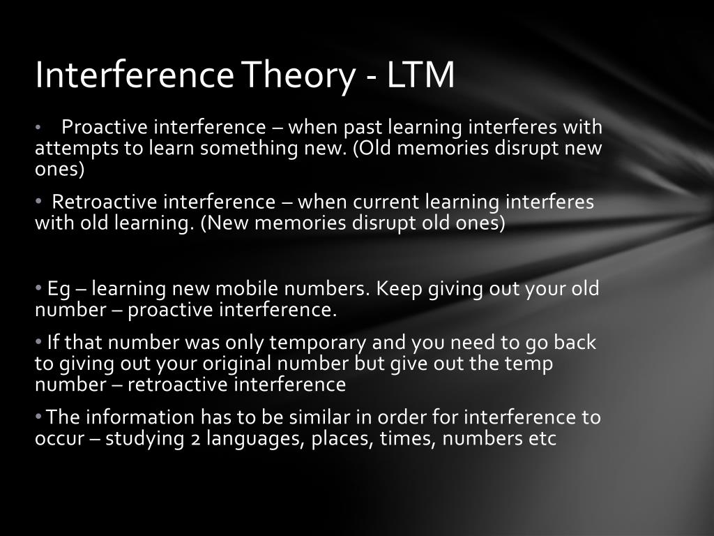 Interference Theory - LTM • Proactive interference – when past learning interferes with attempts to learn something new. (Old memories disrupt new ones) • Retroactive interference – when current learning interferes with old learning. (New memories disrupt old ones) • Eg – learning new mobile numbers. Keep giving out your old number – proactive interference. • If that number was only temporary and you need to go back to giving out your original number but give out the temp number – retroactive interference • The information has to be similar in order for interference to occur – studying 2 languages, places, times, numbers etc