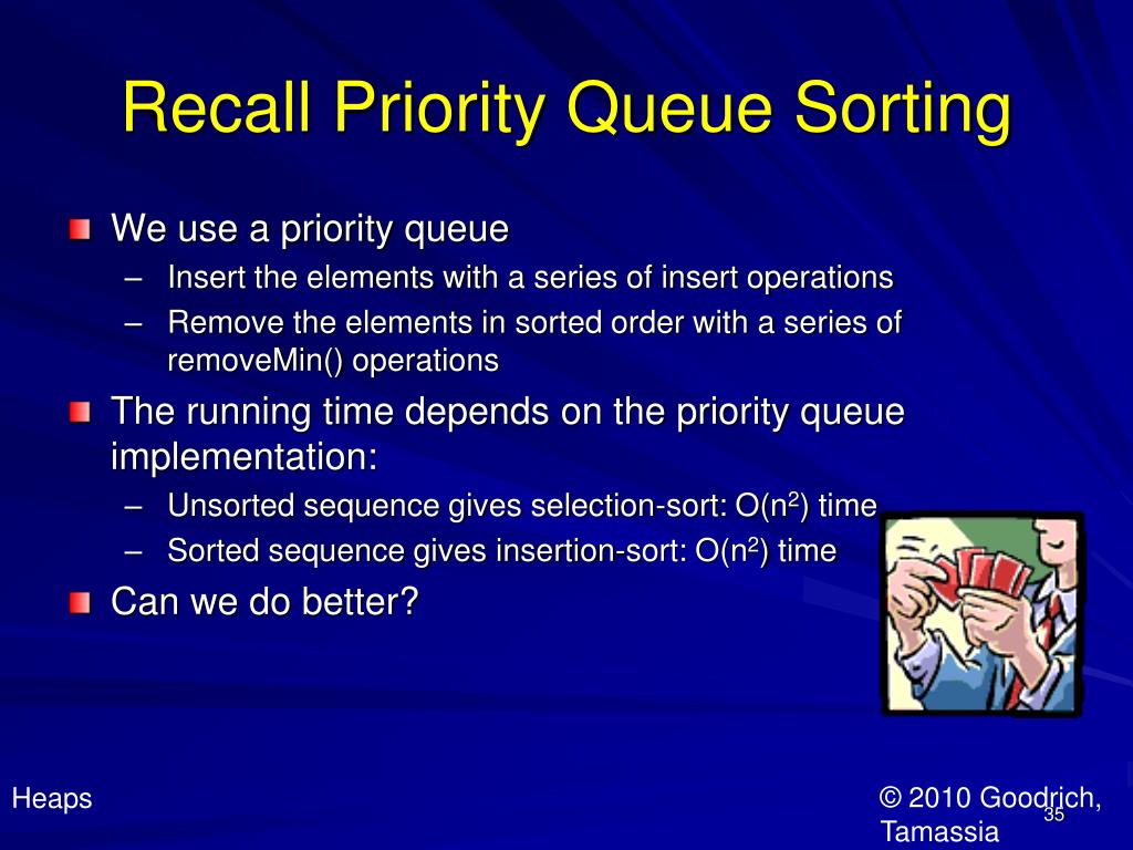 Priority Queues Insertion-Sort Example Sequence S Priority queue P Input: (7,4,8,2,5,3,9) () Phase 1 (a) (4,8,2,5,3,9) (7) (b) (8,2,5,3,9) (4,7) (c) (2,5,3,9) (4,7,8) (d) (5,3,9) (2,4,7,8) (e) (3,9) (2,4,5,7,8) (f) (9) (2,3,4,5,7,8) (g) () (2,3,4,5,7,8,9) Phase 2 (a) (2) (3,4,5,7,8,9) (b) (2,3) (4,5,7,8,9) .. .. .. (g) (2,3,4,5,7,8,9) ()