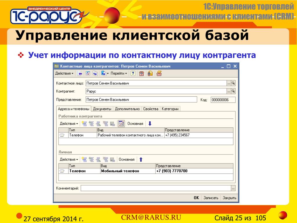 Управление клиентской базой • Учет информации по контактному лицу контрагента