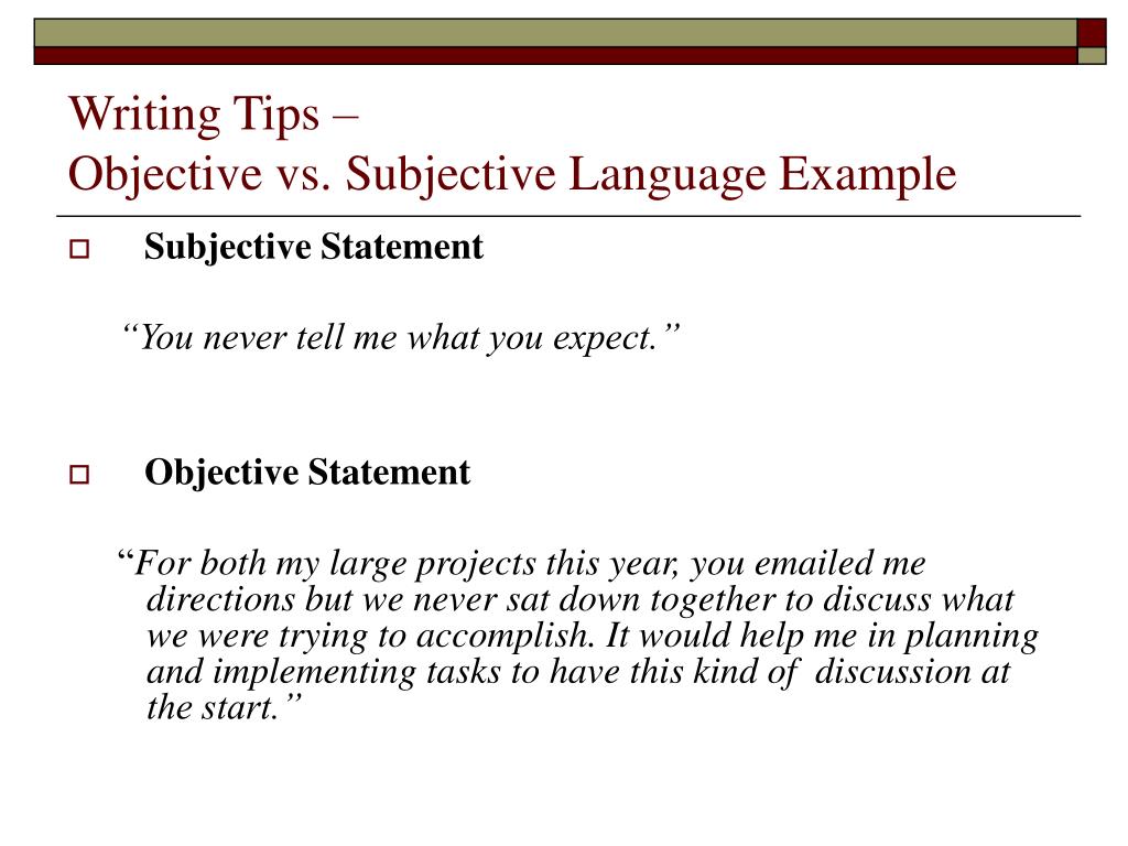 Writing Tips – Objective vs. Subjective Language Example • Subjective Statement “You never tell me what you expect.” • Objective Statement “For both my large projects this year, you emailed me directions but we never sat down together to discuss what we were trying to accomplish. It would help me in planning and implementing tasks to have this kind of discussion at the start.”