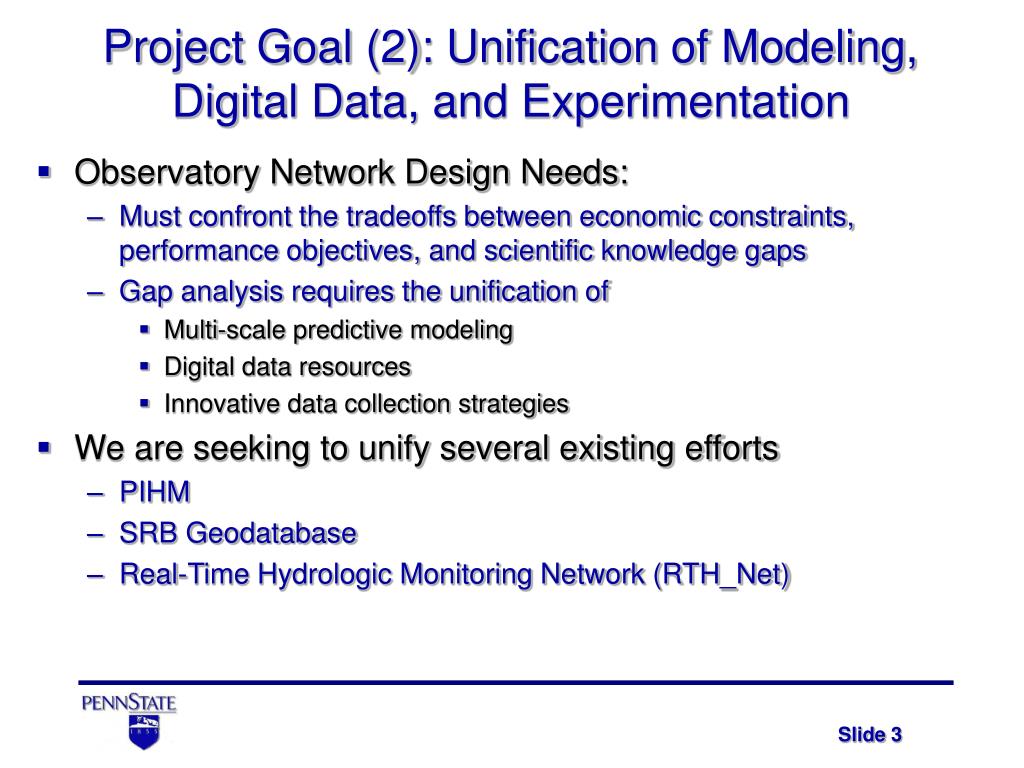 Project Goal (2): Unification of Modeling, Digital Data, and Experimentation • Observatory Network Design Needs: • Must confront the tradeoffs between economic constraints, performance objectives, and scientific knowledge gaps • Gap analysis requires the unification of • Multi-scale predictive modeling • Digital data resources • Innovative data collection strategies • We are seeking to unify several existing efforts • PIHM • SRB Geodatabase • Real-Time Hydrologic Monitoring Network (RTH_Net)
