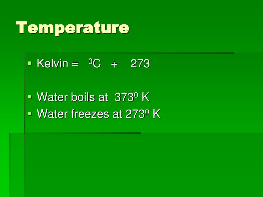 Temperature • Kelvin = 0C + 273 • Water boils at 3730 K • Water freezes at 2730 K