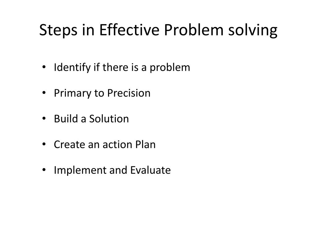 Steps in Effective Problem solving • Identify if there is a problem • Primary to Precision • Build a Solution • Create an action Plan • Implement and Evaluate