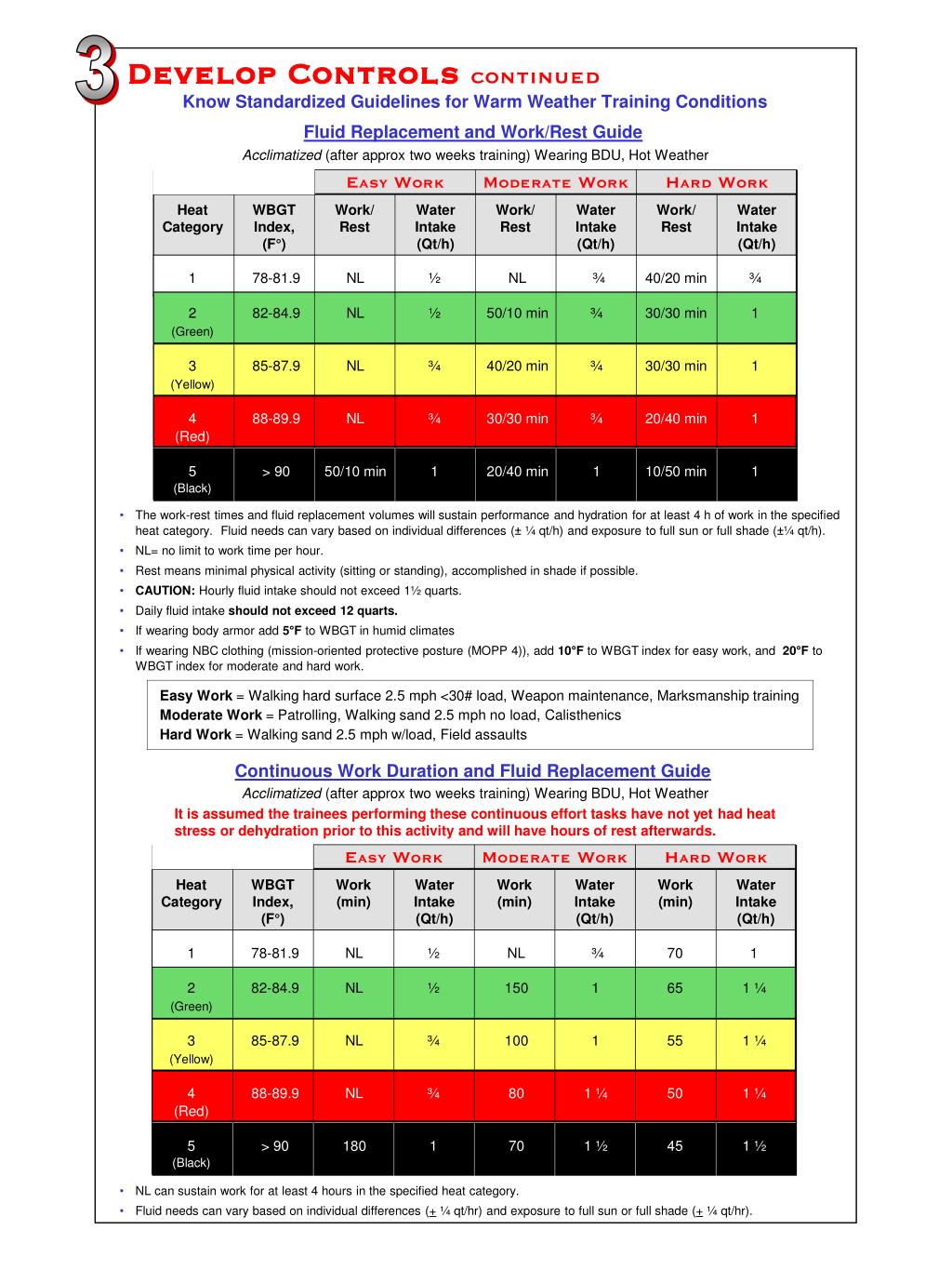 3 Develop Controls continued Know Standardized Guidelines for Warm Weather Training Conditions Fluid Replacement and Work/Rest Guide Acclimatized (after approx two weeks training) Wearing BDU, Hot Weather • The work-rest times and fluid replacement volumes will sustain performance and hydration for at least 4 h of work in the specified heat category. Fluid needs can vary based on individual differences (± ¼ qt/h) and exposure to full sun or full shade (±¼ qt/h). • NL= no limit to work time per hour. • Rest means minimal physical activity (sitting or standing), accomplished in shade if possible. • CAUTION: Hourly fluid intake should not exceed 1½ quarts. • Daily fluid intake should not exceed 12 quarts. • If wearing body armor add 5°F to WBGT in humid climates • If wearing NBC clothing (mission-oriented protective posture (MOPP 4)), add 10°F to WBGT index for easy work, and 20°F to WBGT index for moderate and hard work. Easy Work = Walking hard surface 2.5 mph <30# load, Weapon maintenance, Marksmanship training Moderate Work = Patrolling, Walking sand 2.5 mph no load, Calisthenics Hard Work = Walking sand 2.5 mph w/load, Field assaults Continuous Work Duration and Fluid Replacement Guide Acclimatized (after approx two weeks training) Wearing BDU, Hot Weather It is assumed the trainees performing these continuous effort tasks have not yet had heat stress or dehydration prior to this activity and will have hours of rest afterwards. • NL can sustain work for at least 4 hours in the specified heat category. • Fluid needs can vary based on individual differences (+ ¼ qt/hr) and exposure to full sun or full shade (+ ¼ qt/hr).
