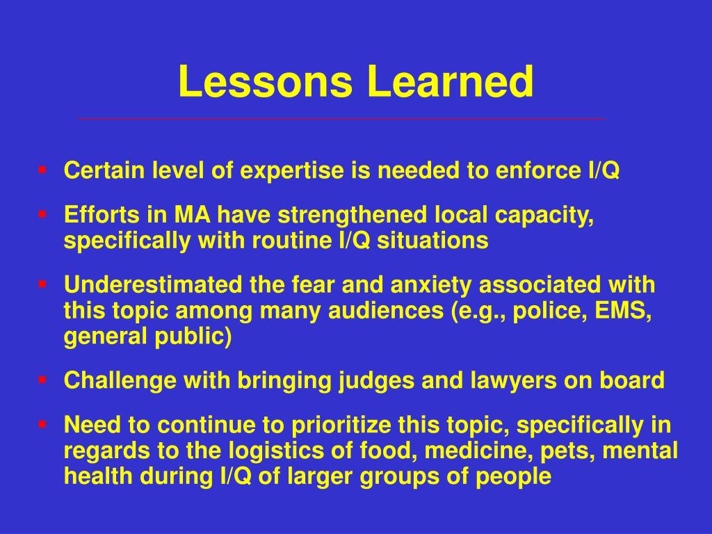 Lessons Learned • Certain level of expertise is needed to enforce I/Q • Efforts in MA have strengthened local capacity, specifically with routine I/Q situations • Underestimated the fear and anxiety associated with this topic among many audiences (e.g., police, EMS, general public) • Challenge with bringing judges and lawyers on board • Need to continue to prioritize this topic, specifically in regards to the logistics of food, medicine, pets, mental health during I/Q of larger groups of people