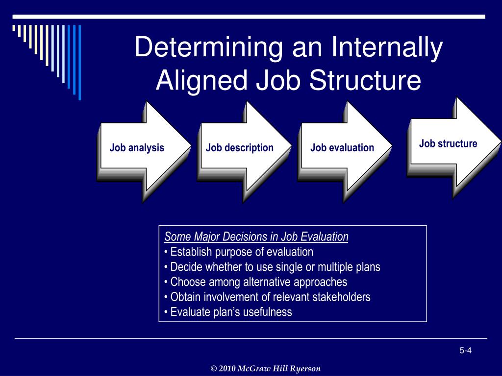 Determining an Internally Aligned Job Structure Job structure Job analysis Job description Job evaluation • Some Major Decisions in Job Evaluation • Establish purpose of evaluation • Decide whether to use single or multiple plans • Choose among alternative approaches • Obtain involvement of relevant stakeholders • Evaluate plan’s usefulness