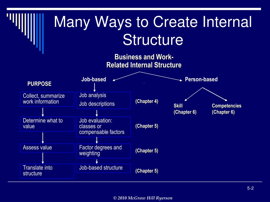 COMPENSATION Third Canadian Edition Milkovich, Newman, Cole. Chapter 5 Evaluating Work: Job Evaluation. Many Ways to Create Internal Structure. Business and Work-Related Internal Structure. Job-based. Person-based. PURPOSE. Collect, summarize work information . Job analysis