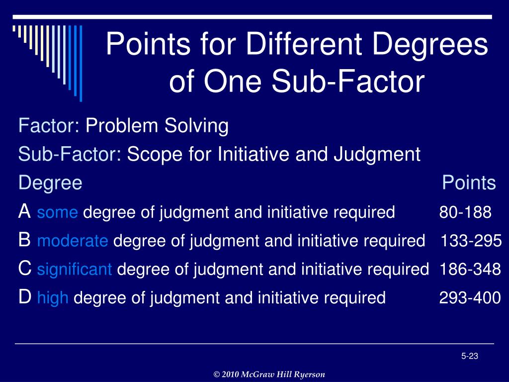Points for Different Degrees of One Sub-Factor Factor: Problem Solving Sub-Factor: Scope for Initiative and Judgment Degree Points A some degree of judgment and initiative required 80-188 B moderate degree of judgment and initiative required 133-295 C significant degree of judgment and initiative required 186-348 D high degree of judgment and initiative required 293-400