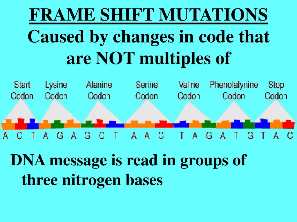 FRAME SHIFT MUTATIONSCaused by changes in code that are NOT multiples of DNA message is read in groups of three nitrogen bases
