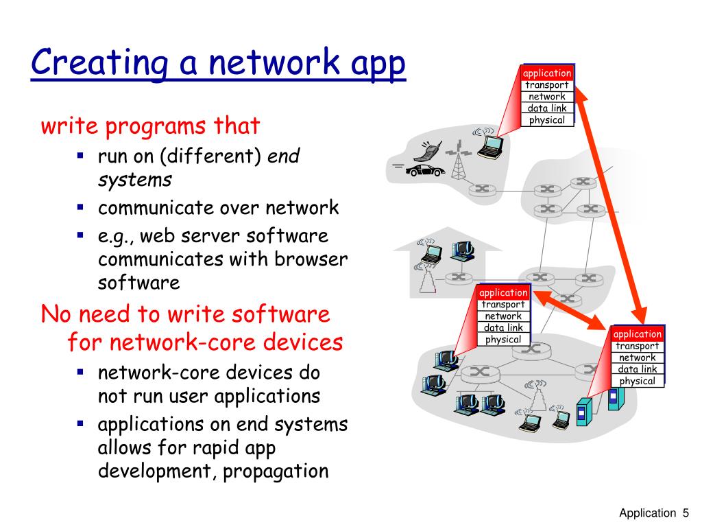e-mail web instant messaging remote login P2P file sharing multi-user network games streaming stored video (YouTube) voice over IP real-time video conferencing cloud computing … … Some network apps Application 4
