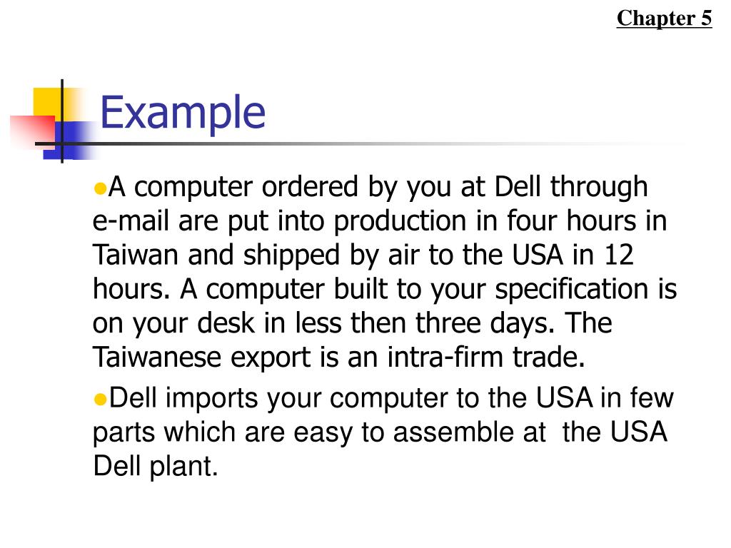 Example • A computer ordered by you at Dell through e-mail are put into production in four hours in Taiwan and shipped by air to the USA in 12 hours. A computer built to your specification is on your desk in less then three days. The Taiwanese export is an intra-firm trade. • Dell imports your computer to the USA in few parts which are easy to assemble at the USA Dell plant.