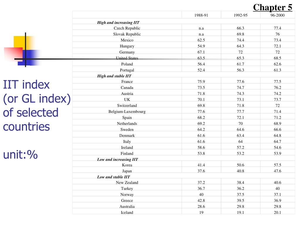 1988-91 1992-95 96-2000 High and increasing IIT Czech Republic n.a 66.3 77.4 Slovak Republic n.a 69.8 76 Mexico 62.5 74.4 73.4 Hungary 54.9 64.3 72.1 Germany 67.1 72 72 United States 63.5 65.3 68.5 Poland 56.4 61.7 62.6 Portugal 52.4 56.3 61.3 High and stable IIT France 75.9 77.6 77.5 Canada 73.5 74.7 76.2 Austria 71.8 74.3 74.2 UK 70.1 73.1 73.7 Switzerland 69.8 71.8 72 Belgium-Luxembourg 77.6 77.7 71.4 Spain 68.2 72.1 71.2 Netherlands 69.2 70 68.9 Sweden 64.2 64.6 66.6 Denmark 61.6 63.4 64.8 Italy 61.6 64 64.7 Ireland 58.6 57.2 54.6 Finland 53.8 53.2 53.9 Low and increasing IIT Korea 41.4 50.6 57.5 Japan 37.6 40.8 47.6 Low and stable IIT New Zealand 37.2 38.4 40.6 Turkey 36.7 36.2 40 Norway 40 37.5 37.1 Greece 42.8 39.5 36.9 Australia 28.6 29.8 29.8 Iceland 19 19.1 20.1 IIT index (or GL index)of selected countriesunit:%