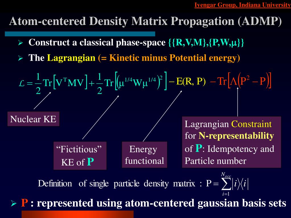 Atom-centered Density Matrix Propagation (ADMP): Theory and Applications Srinivasan S. Iyengar Department of Chemistry and Department of Physics, Indiana University