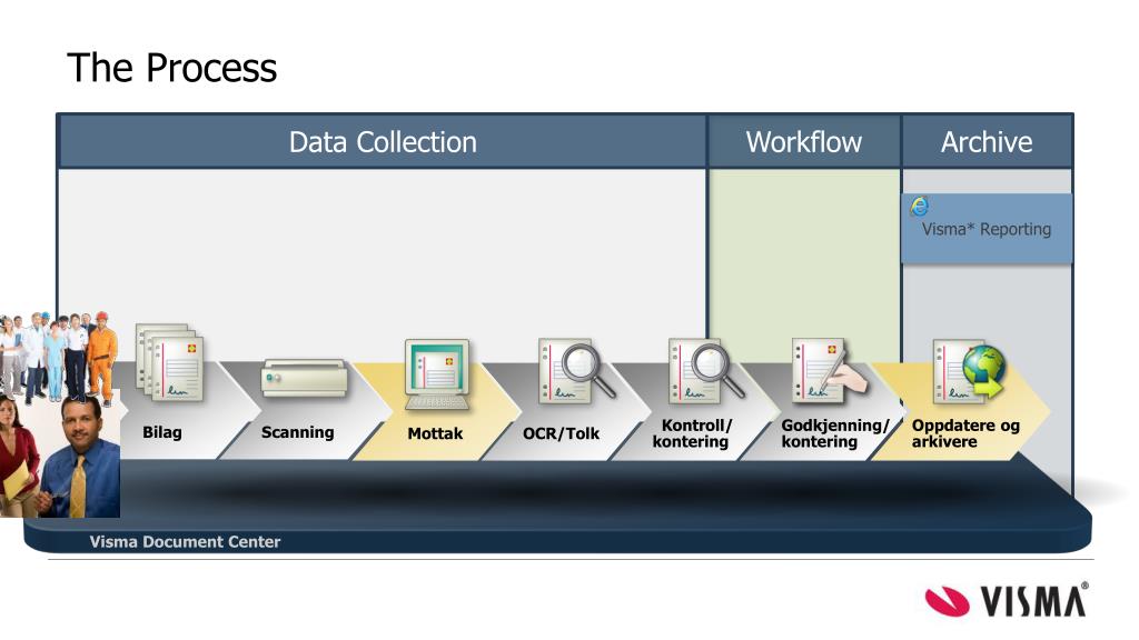 The Process Data Collection Workflow Archive Visma* Reporting Visma Document Center Bilag Scanning Mottak Kontroll/kontering OCR/Tolk Godkjenning/kontering Oppdatere og arkivere = mest tid spart