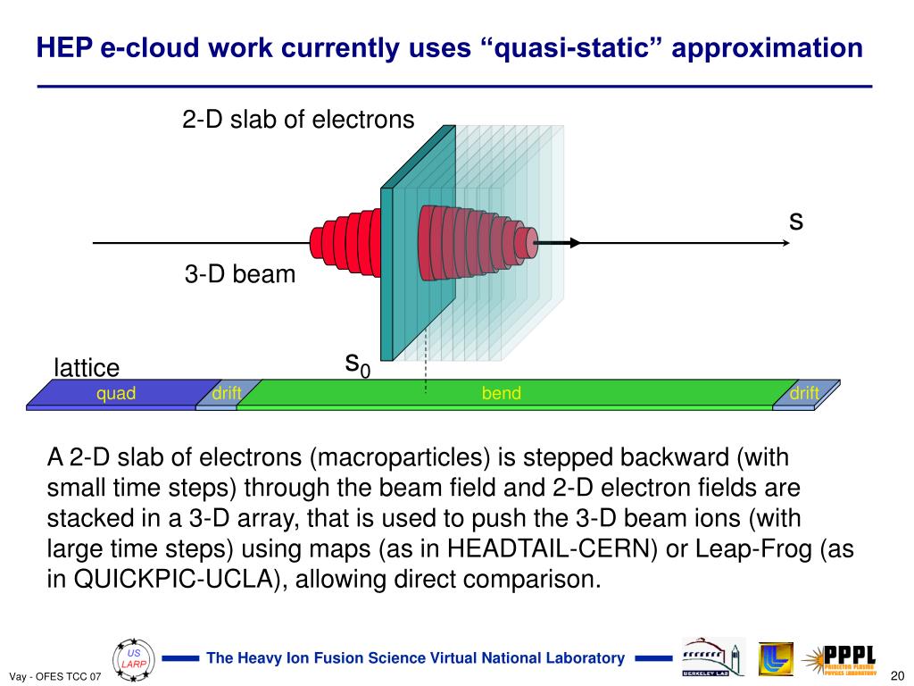 quad drift bend drift HEP e-cloud work currently uses “quasi-static” approximation 2-D slab of electrons s 3-D beam s0 lattice A 2-D slab of electrons (macroparticles) is stepped backward (with small time steps) through the beam field and 2-D electron fields are stacked in a 3-D array, that is used to push the 3-D beam ions (with large time steps) using maps (as in HEADTAIL-CERN) or Leap-Frog (as in QUICKPIC-UCLA), allowing direct comparison.