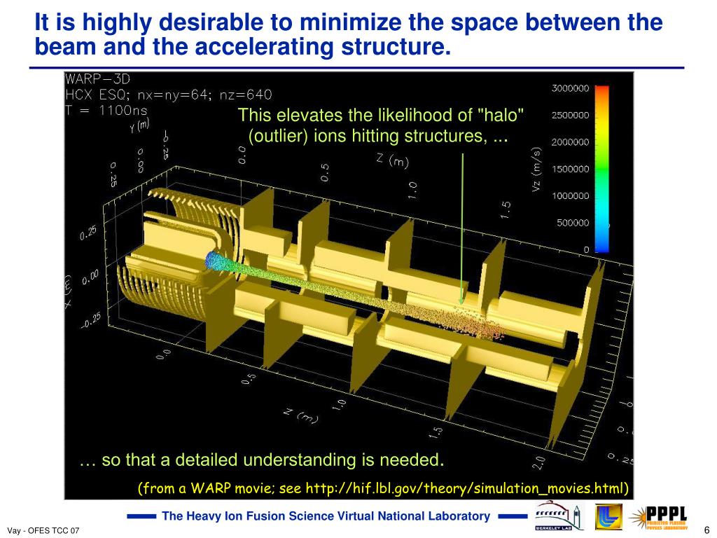 It is highly desirable to minimize the space between the beam and the accelerating structure. This elevates the likelihood of "halo" (outlier) ions hitting structures, ... … so that a detailed understanding is needed. (from a WARP movie; see http://hif.lbl.gov/theory/simulation_movies.html)