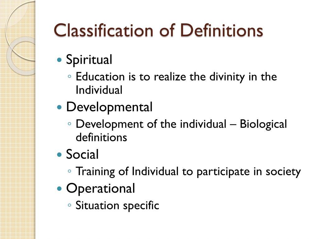 Classification of Definitions • Spiritual • Education is to realize the divinity in the Individual • Developmental • Development of the individual – Biological definitions • Social • Training of Individual to participate in society • Operational • Situation specific
