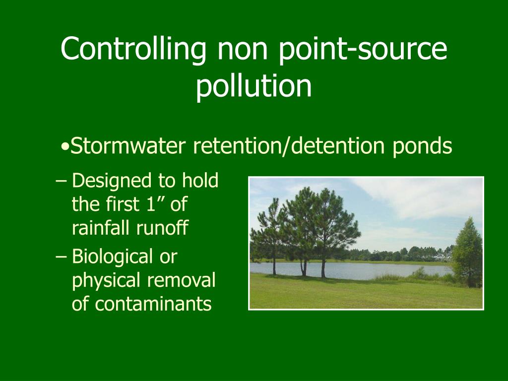 Controlling non point-source pollution • Designed to hold the first 1” of rainfall runoff • Biological or physical removal of contaminants • Stormwater retention/detention ponds